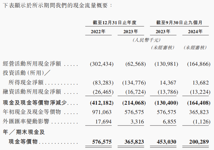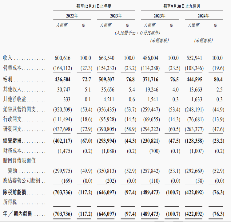 2022年、2023年以及2024年前三季度亏损分别为7.04亿元、6.46亿元和4.22亿元,经调整净亏损分别为3.38亿元、2.42亿元和9360万元。