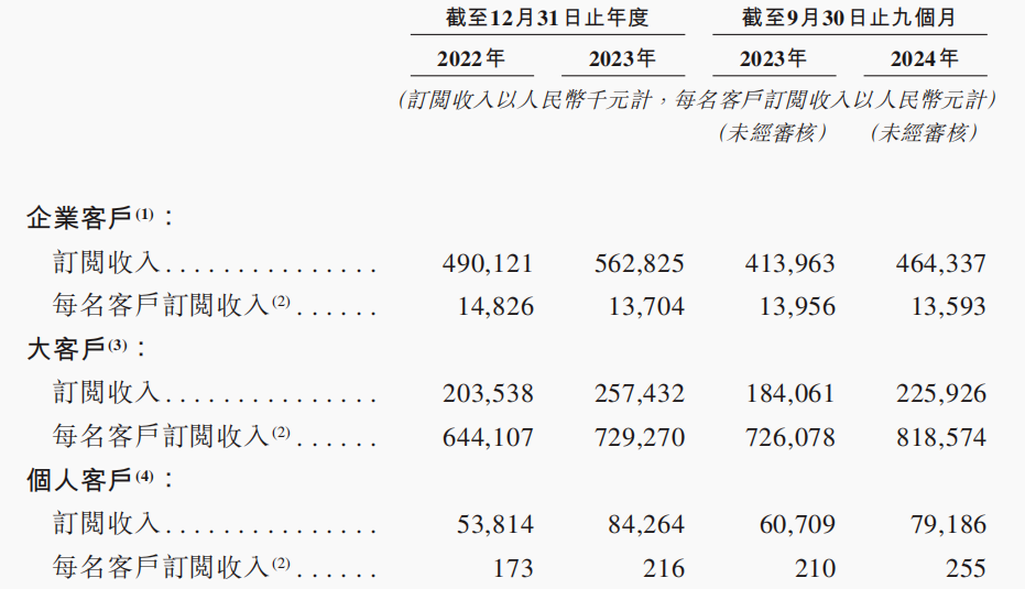 截至2022年、2023年以及2024年前三季度,个人客户数量分别为31.11万名、39.06万名及41.39万名。同期企业客户的数量则分别为3.31万名、4.11万名和4.55万名;企业客户订阅收入分别为4.90亿元、5.63亿元和4.64亿元,分别占各期总订阅收入的81.6%、84.8%和84.0%。