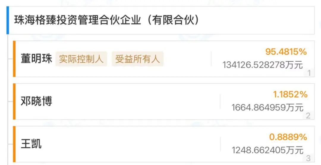 珠海格臻由格力18位管理人员出资成立,其中董明珠股份高达95.48%。