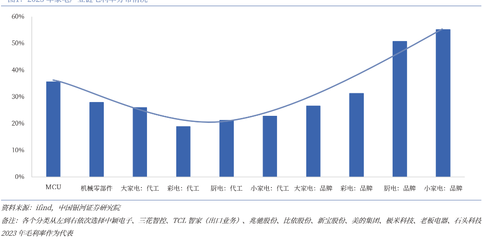 上游核心元器件方面,2023年MCU等电子元器件毛利率在30%以上,以空调压缩机、制冷阀为代表的机械零部件企业的销售毛利率为27.9%,均高于家电代工企业,处于产业中间环节的代工业务毛利率相对较低。