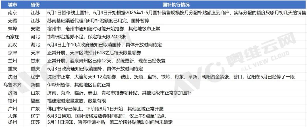 在国补资金短缺的背景下,2025年5月起,多地开始进入国补 “限额模式”,有的地方甚至直接暂停补贴。目前了解,广东佛山、甘肃肃州、辽宁营口等多地已经出现断补情况。据业内人士透露,目前部分地区虽未明确提出中断补贴,但国补资金池早已透支,如按照现有情况继续衍生下去,小商户垫资压力将持续飙升,市场信任度也将会大受冲击。