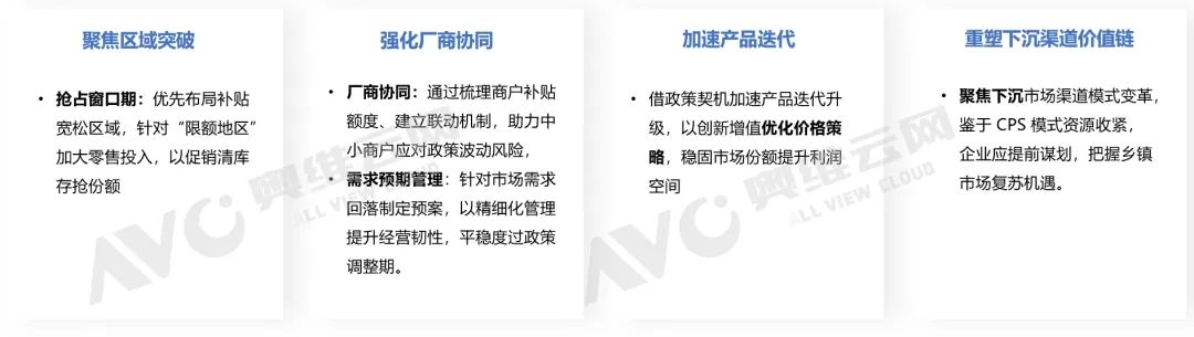 此外,厂商应做好 Q3-Q4 市场需求回落的预案,从 “抢资源、冲销量” 向 “提质量、稳利润”改变,通过精细化库存管理、成本控制和精准营销,提升经营韧性,平稳度过政策调整阵痛期。加速产品迭代,优化价格策略:抓住政策调整带来的价格回升机遇,加速新品上市与产品结构升级。避免单纯涨价引发消费者抵触,而是通过技术创新(如智能功能、能效升级)、场景化营销提升产品附加值,在提升利润的同时稳固市场份额。重塑下沉渠道价值链:关注下沉市场渠道模式变化。随着 CPS 模式资源收缩,分销体系有望回归主流。企业需提前规划渠道政策,优化产品定价、返利机制,重新激活经销商积极性,抢占乡镇市场复苏先机。