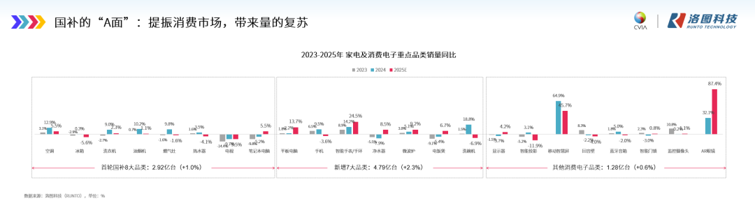 根据洛图科技(RUNTO)数据显示,预测2025年全年,首轮国补覆盖的8大品类(空调、冰箱、洗衣机、油烟机、燃气灶、热水器、电视和笔记本电脑)合计销量达到2.92亿台,同比增长1%。之后增加的7大品类(平板电脑、手机、智能手表/手环、净水器、微波炉、电饭煲和洗碗机)合计销量4.79亿台,同比增长2.3%。其它消费电子品类(显示器、智能投影、移动智慧屏、回音壁、蓝牙音箱、智能门锁、监控摄像头和AR眼镜)合计销量为1.28亿台,同比增长0.6%。