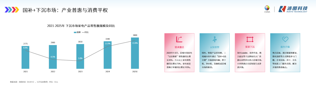 国补政策有效激发了下沉市场的消费活力。根据洛图科技(RUNTO)数据显示,预测2025年全年,中国家电下沉市场零售额预计达3800亿元,同比增长13.8%,增速显著高于整体市场。