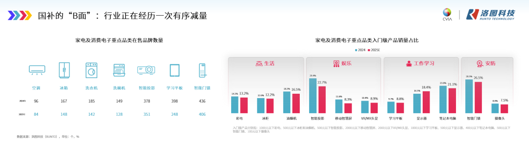 根据洛图科技(RUNTO)统计的2025年重点家电、消费电子品类的在售品牌数量变化可见一斑,相比2024年,多个类目已有几十至上百个品牌陆续退出市场竞争。与此同时,在各类家电与消费电子产品中,入门级、低附加值产品的销量占比普遍下降,显示出消费端的选择正在向中高端转移。