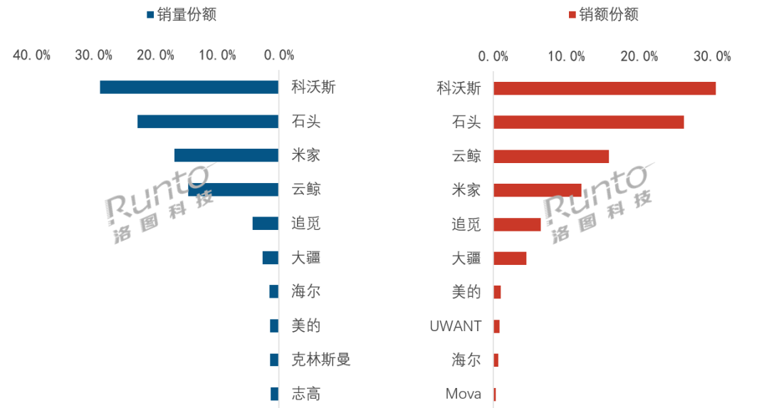 追觅的量额均排在第五名,2025年推出了S50系列(首款于2025年2月发布),产品搭载100℃高温蒸汽灭菌与40℃恒温热水拖地技术,且接入了DeepSeek大模型。该系列使其在4500+价位段的销量份额同比上升了18.6个百分点。