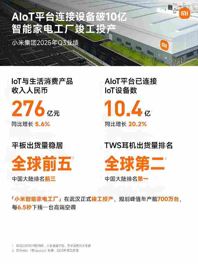 截至2025年9月30日,小米AIoT平台上连接的物联网设备数量达到10.35亿台,同比增长20.2%。与此同时,其互联网服务收入为94亿元,同比增长10.8%,创下历史新高。