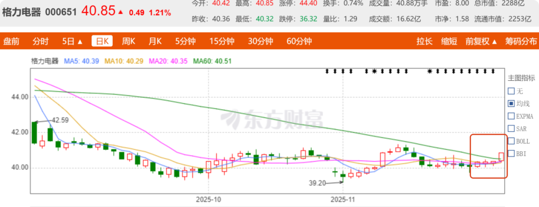 在格力举行年度第二次股东大会后,格力股价开始回升,11月26日至12月1日,股价迎来四连涨。截至12月1日收盘,格力收盘价为40.85元,相比年初43.49元的开盘价,年内股价甚至下跌了6%,最新市值为2288亿元。而2024年格力电器股价全年上涨23.81%,显著跑赢同期沪深300指数(涨幅1.61%)。今年股价则相对平稳。