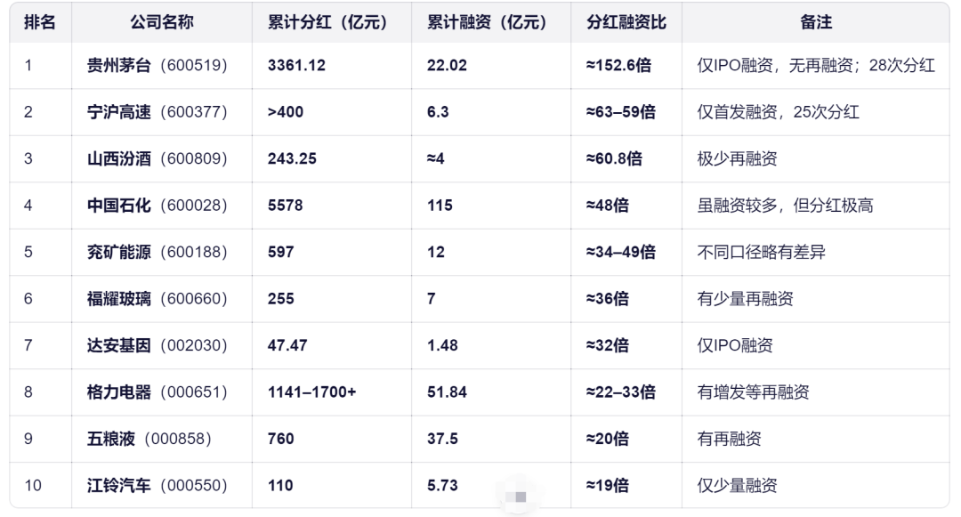 在分红和融资比方面,格力稳进前十,A股上市公司中分红和融资比最高的是贵州茅台,其累计融资22.02亿元,分红3361.12亿元是IPO募资净额的 168.21 倍,是累计融资的153倍。格力33倍的分红融资比位居第八位。