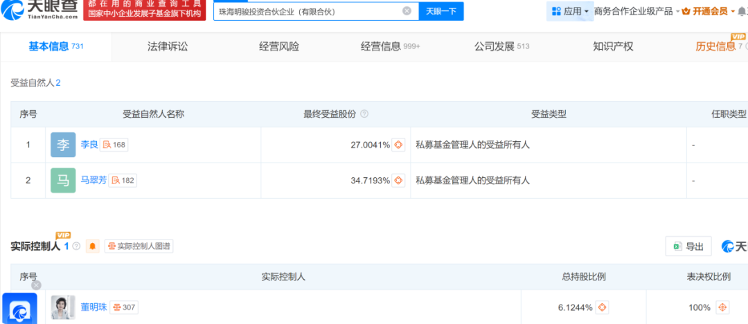 董明珠是最大的自然人股东,还是持股16.36%的格力电器第一大股东珠海明骏投资合伙企业(有限合伙)的持股人,天眼查显示董明珠是珠海明骏投资合伙企业(有限合伙)实际控制人,持股6.1244%,表决权为100%。可以说董明珠不仅可以直接从格力分红中获益,还能从珠海明骏投资合伙企业(有限合伙)的分红中获益。2024年格力累计分红167.55亿元,以珠海明骏16.36%的持股比例计算,分红金额为167.55亿元×16.36%≈27.4亿元。董明珠约能从中获利1.7亿元。或意味着现在董明珠每年分红收益能近4亿元。