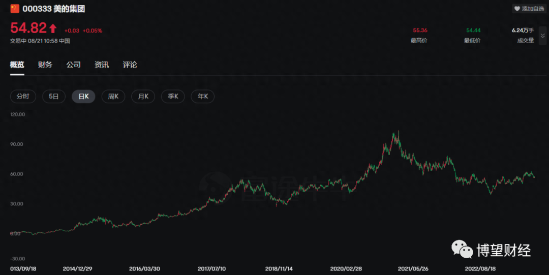 2018年,美的集团创始人何享健曾在50周年庆典上高喊,“美的集团未来的目标是产值和市值均将达到5000亿元”,此后一年美的集团股价一路腾飞,由当时不到40元倍增至近100元,但好景不长,2021年以来迎来大幅回调,此后更是波动下滑,截至发稿日股价报54.82元,市值3800多亿。