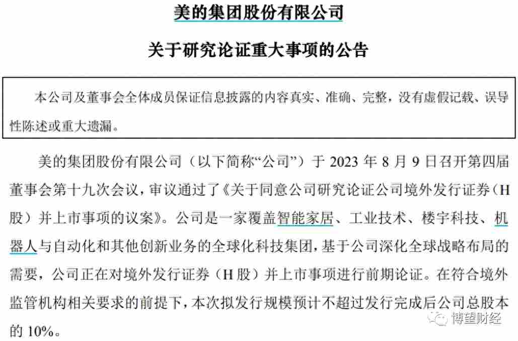 先来看看官方对赴港的解读,美的集团在公告中明确提及,“公司是一家覆盖智能家居、工业技术、楼宇科技、机器人与自动化和其他创新业务的全球化科技集团,基于公司深化全球战略布局的需要,公司正在对境外发行证券(H股)并上市事项进行前期论证。”